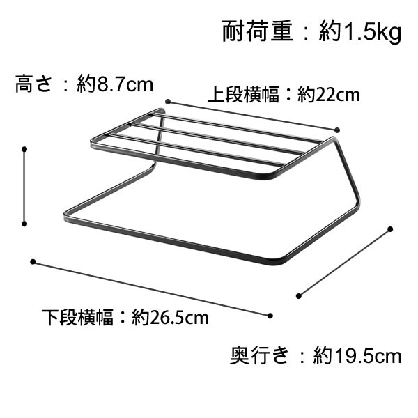 サイズ約 W26.5XH8.7×D19.5 cm素材スチール(粉体塗装)耐荷重約1.5k g備考直径約15〜26cmのお皿が、各段に約6〜8枚程度収納可能シンプルデザインで食器棚の整理整頓に活躍! 食器棚からお皿やお椀を取り出すとき、無造作に積み重ねられていたり、斜めになっていたりして、落として割ってしまったなんて経験ありませんか? そんな収納の悩みを解決してくれるのがこちらのシリーズです!いつも使うものだから、取り出しやすく尚且つ収納しやすいほうがいいですよね♪