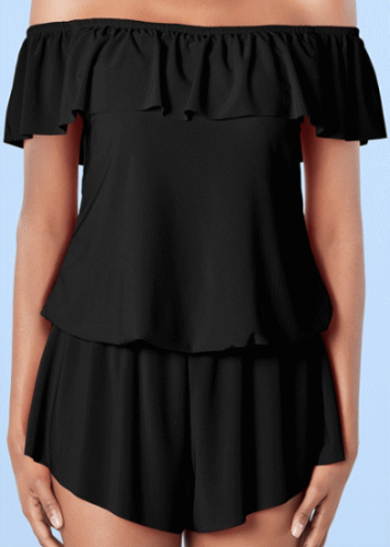 水着 レディース ワンピース 袖付き オフショルダーフリル水着 ママ水着 ロンパース オールインワンショートパンツ ショーツ 黒水着 ブラック バスト 盛れる体型カバー スイムウェア ビーチウエア セクシー かわいいラッフルスイムロンパース水着
