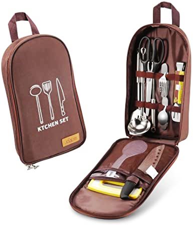 Delicacyキャンプキッチン用品(10点セット・ブラウン) 持ち運び簡単!バーベキューキャンプ調理器具トラベルキット防水ケース、まな板、パドル、トング、はさみ、鍋、へら、ナイフ、栓抜き トラベルセット アウトドア 茶色